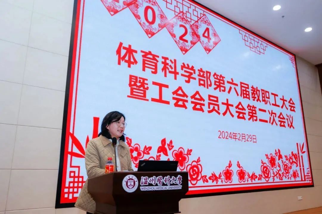 陈素云作大会总结发言。她指出,今年是新中国成立75周年,是实现“十四五”规划目标任务的关键一年。在这样的时间节点召开新年第一会意义重大。此次会议既是对去年成绩的总结,也是对新一年努力方向的规划。同时,陈素云重点围绕省委书记易炼红在省委新春第一会上关于全面加强“三支队伍”建设的人才强省战略的讲话、学校党委书记吕一军在学校新春第一会上关于聚焦干部人才队伍建设及部署学校新学期重点工作的讲话,结合学部工作实际,着重从基层党建、意识形态和人才工作方面强调并提出三点要求:一要以高标准党建推动部门全体教职工凝心聚力;二要以高水平教师队伍建设推动部门事业发展;三要以高影响力体育文化建设服务学校育人大局。最后,陈素云鼓舞大家要振奋龙马精神,以龙腾虎跃、鱼跃龙门的干劲闯劲,主动作为、开拓创新、拼搏奉献,共同书写黄色导航 事业新篇章,为学校争创“双一流”贡献温医大体育人的力量。