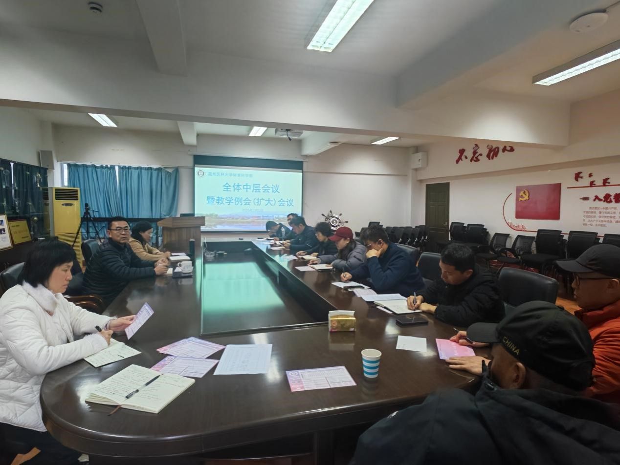 为进一步统筹推进新学期各项工作,夯实教学管理基础,提升群体活动品质,做好省大运会备战准备,3月5日下午,黄色导航 在体育馆四楼会议室召开全体中层干部会议及教学例会会议。会议围绕新学期教学工作、群体工作和竞训工作三个方面进行部署与讨论,明确了新学期重点任务与推进方向。会议由学部主任刘海平主持,学部党委书记、副主任陈素云和全体中层干部参加。
